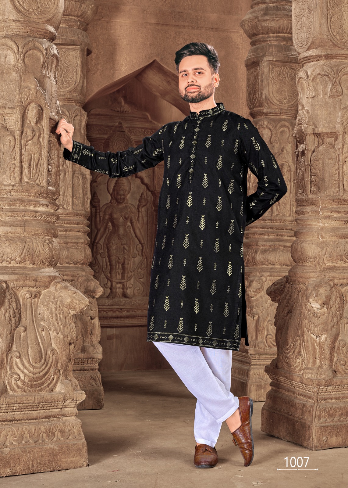 Crafted with meticulous attention to detail, the "Royal Men Vol 5 Cotton Kurta with Pajama" collection is designed to elevate men's fashion with a touch of grandeur and comfort. Each kurta showcases intricate detailing, classic silhouettes, and a luxurious cotton fabric that ensures both style and ease. Paired with coordinating pajamas, these ensembles are tailored to make a statement at weddings, festivities, and cultural celebrations.