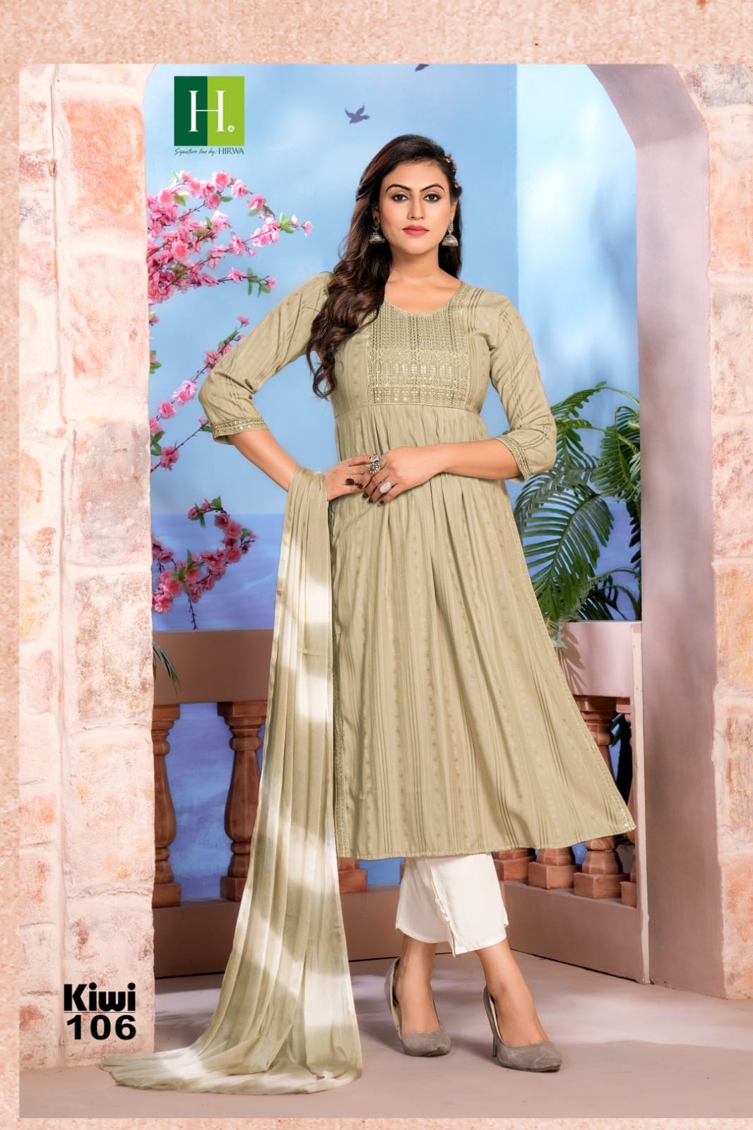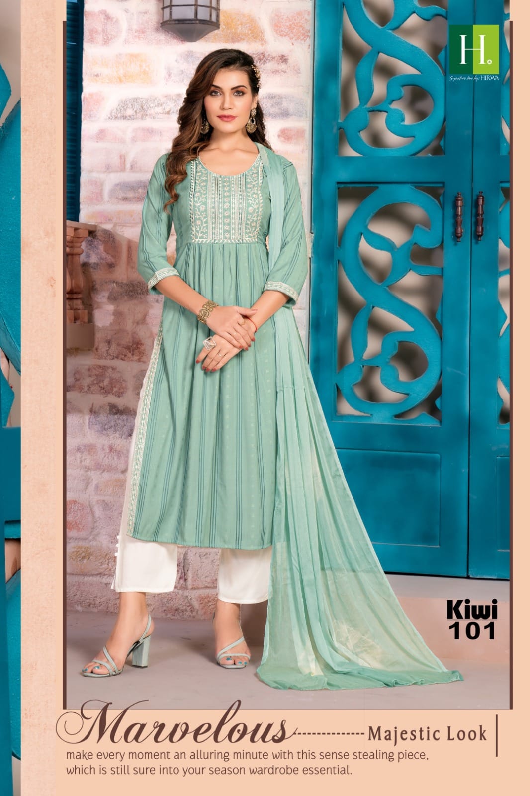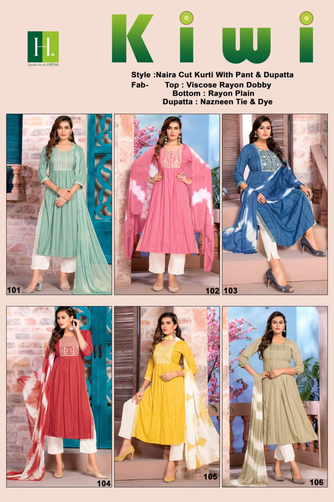 Hirwa Kiwi Viscose Rayon Nayra Cut Kurti Bottom Dupatta Collection