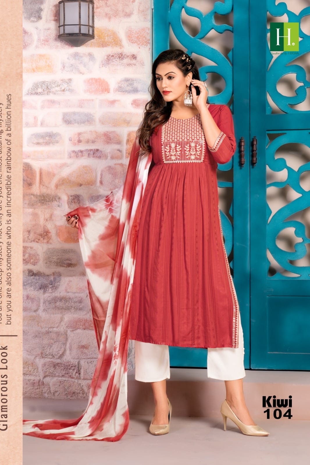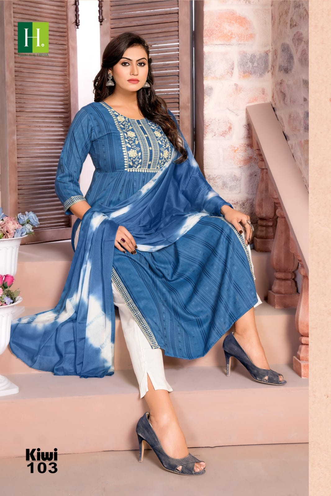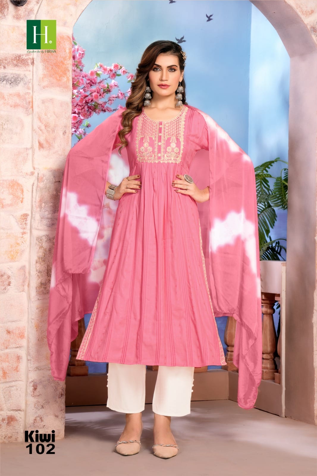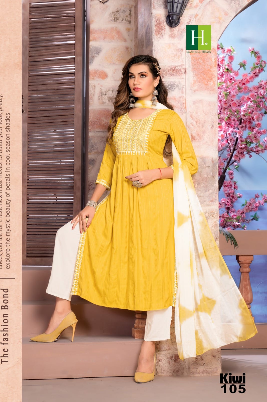 Hirwa Kiwi Viscose Rayon Nayra Cut Kurti Bottom Dupatta Collection