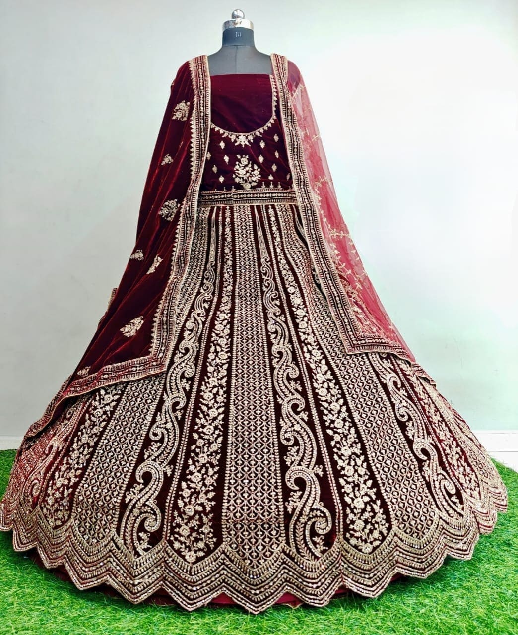 | Fabric Description | Velvet || Fabric: Velvet | Work: Embroidery Heavy Jharkan Work | Size: Semi Stitcheed Lehenga Possible Up To 42 | Flair: 4.00 Mtrs | Blouse Fabric: Same As Lehenga | First Dupatta: Net | Work: Four Sided Lace | Butti Work And Leheriya Work | Length: 2.5 Mtrs | Second (Double) Dupatta: Velvet | Work: Four Sided Lace With Embroidery Work | Small Big Butti Pattern Work And Jharkan Work | Length: 2.5 Mtr |