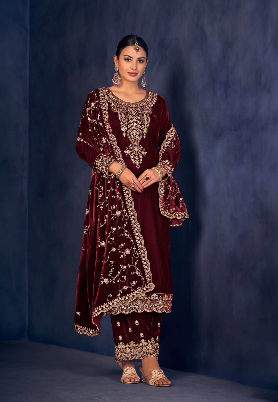 | Fabric Description | Velvet || TOP : PURE VELVET WITH HEAVY EMBROIDERY NECK DAMAN SLEEVES WITH CUTWORK | BOTTOM : PURE VELVET DYED SOLID WITH HEAVY EMBROIDERY WITH CUTWORK | DUPATTA : PURE VELVET WITH HEAVY EMBROIDERY FULL DUPATTA WITH CUTWORK BIG WIDTH(44 PANNA) |