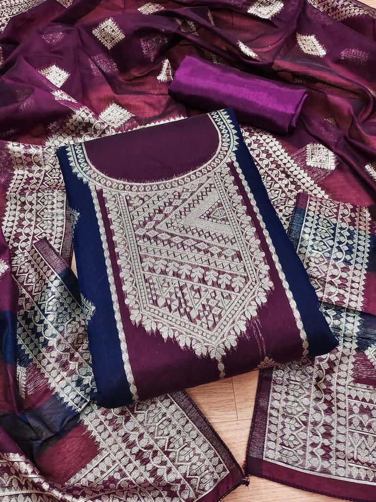 | Fabric Description | Jacquard || TOP : CHANDERI JECARD SILK (2 MTR) | BOTTOM + INNER : SANTOON (3.60 MTRS) | DUPATTA : CHANDERI SILK (2.20 MTR) |